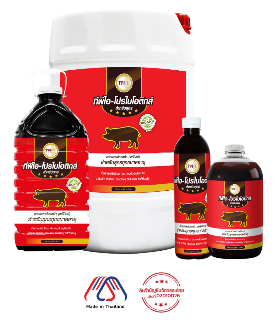 ทีพีไอ-โปรไบโอติกส์ เป็นสารปรุงแต่งน้ำและอาหารของสุกร มีจุลินทรีย์ที่มีประโยชน์ และปลอดภัยสำหรับสุกร ผลิตจากวัตถุดิบอินทรีย์ตามธรรมชาติ จึงเหมาะต่อการใช้กับสุกร ช่วยในระบบการย่อยอาหาร และ ดูดซึมอาหารของสุกร และเพิ่มภูมิคุ้มกัน ทำให้สุกร มีสุขภาพดี เจริญเติบโตดี น้ำหนักดี ลดการใช้ยาปฏิชีวนะ
