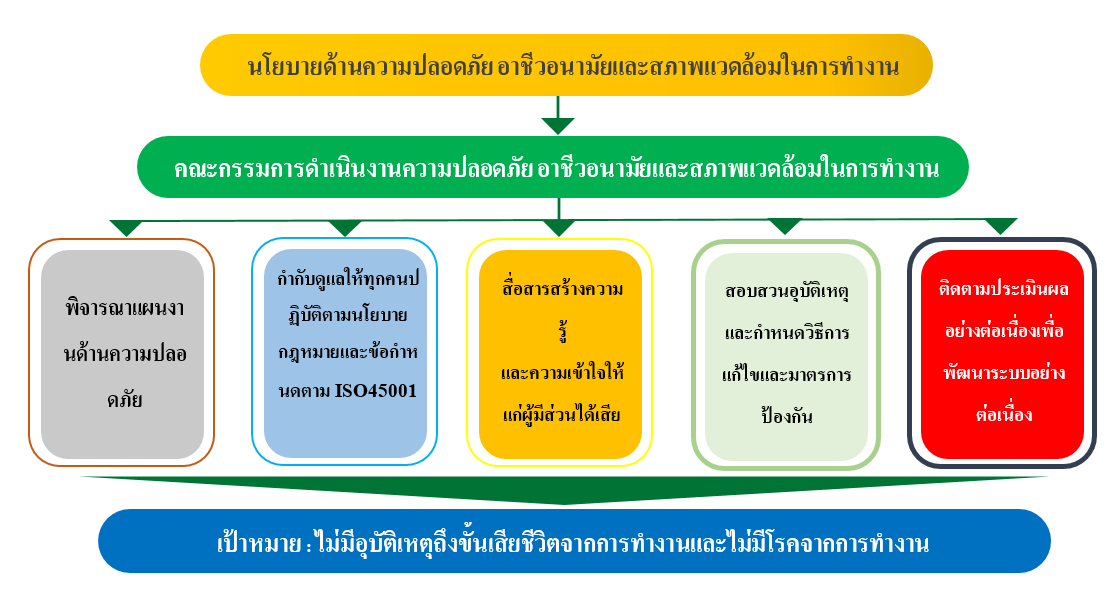 บริษัทมีการตั้งคณะกรรมการดำเนินงานด้านความปลอดภัย อาชีวอนามัยและสิ่งแวดล้อม ประกอบด้วยผู้บริหาร และเจ้าหน้าที่ความปลอดภัยในการทำงานระดับวิชาชีพของบริษัททำหน้าที่ในการบริหารจัดการด้านความปลอดภัย อาชีวอนามัยและสภาพแวดล้อมในการทำงานให้เป็นไปตามข้อกำหนดของมาตรฐานระบบการจัดการอาชีวอนามัยและความปลอดภัย (ISO 45001:2018) และกฎหมายด้านความปลอดภัย โดยมีเป้าหมายไม่มีอุบัติเหตุจากการทำงานถึงขั้นเสียชีวิต และไม่มีการเจ็บป่วยหรือโรคจากการทำงาน