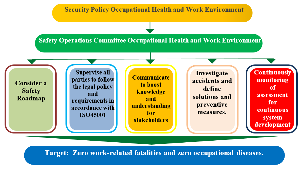The Company has set up a Safety Operations Committee for safeguard of Occupational Health and Environment, which consists of the management team and professional safety officers of the Company, to perform their duties and responsibilities for management of Safety, Occupational health, and Work Environment in compliance with the requirements of the Occupational Health and Safety Management System (ISO 45001:2018) and safety laws. The Company’s objective is no occupational accidents and no occupational illnesses or occupational illnesses from work.