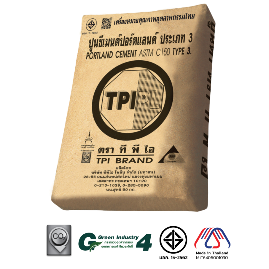 ปูนซีเมนต์ปอร์ตแลนด์ประเภท 3 ตราทีพีไอ (สีดำ) เหมาะที่จะนำไปใช้กับงานคอนกรีตที่ต้องการให้รับน้ำหนักและถอดแบบได้รวดเร็ว ใช้ทำผลิตภัณฑ์คอนกรีตอัดแรงทุกประเภท เช่น เสาเข็ม แผ่นพื้น คาน เสาไฟฟ้า ฯลฯ