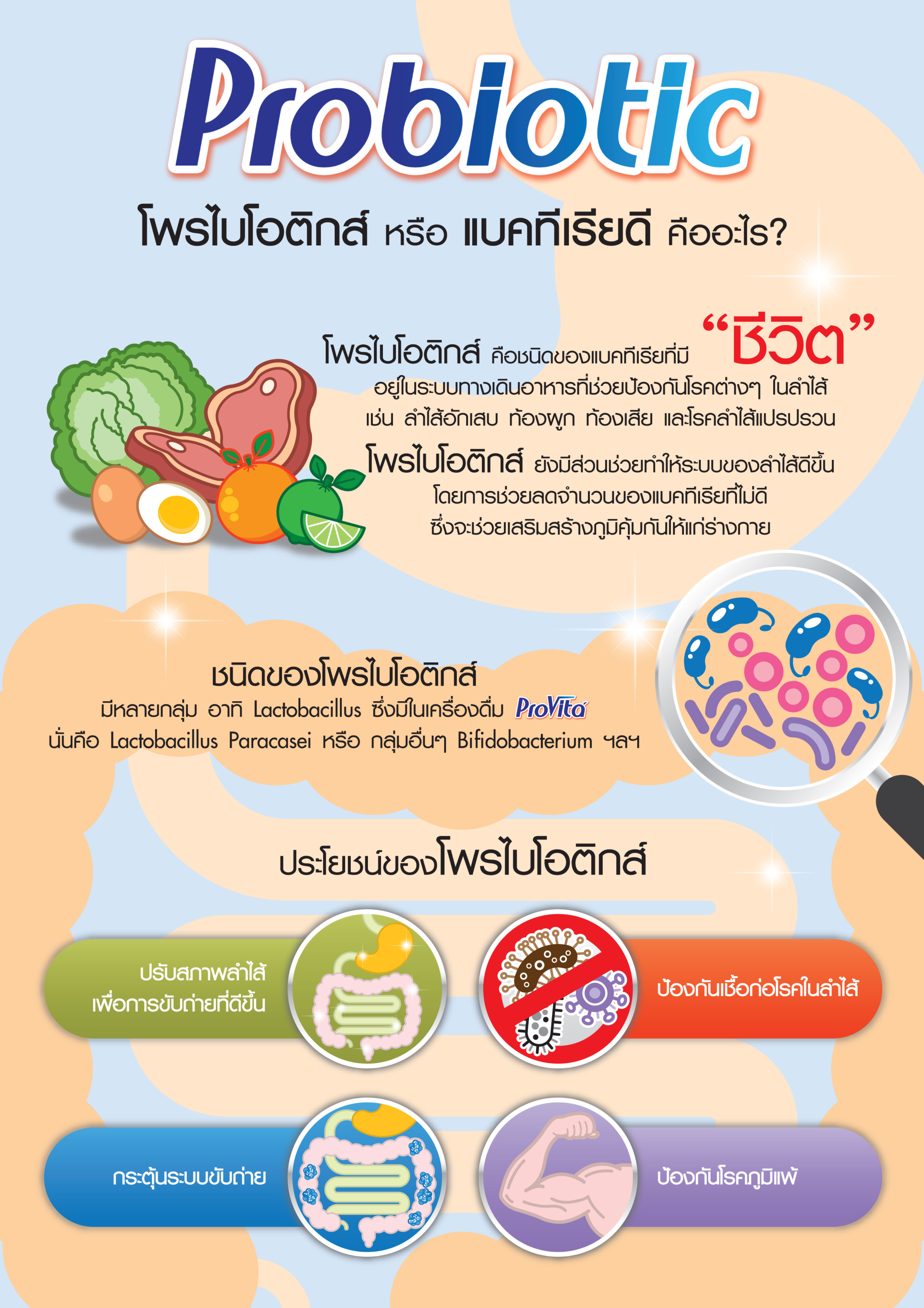 โปรไวต้า เป็นผลิตภัณฑ์ซึ่งมีจุลินทรีย์ Probiotic ผสมอยู่ช่วยย่อยอาหาร เพิ่มภูมิต้านทานทำให้ร่างกายกระปี้กระเปร่า มีชีวิตชีวา การขับถ่ายออกมาถ้ามีลักษณะเหลวแสดงว่าการย่อยอาหารสมบูรณ์ ไม่ใช่อาการท้องเสีย