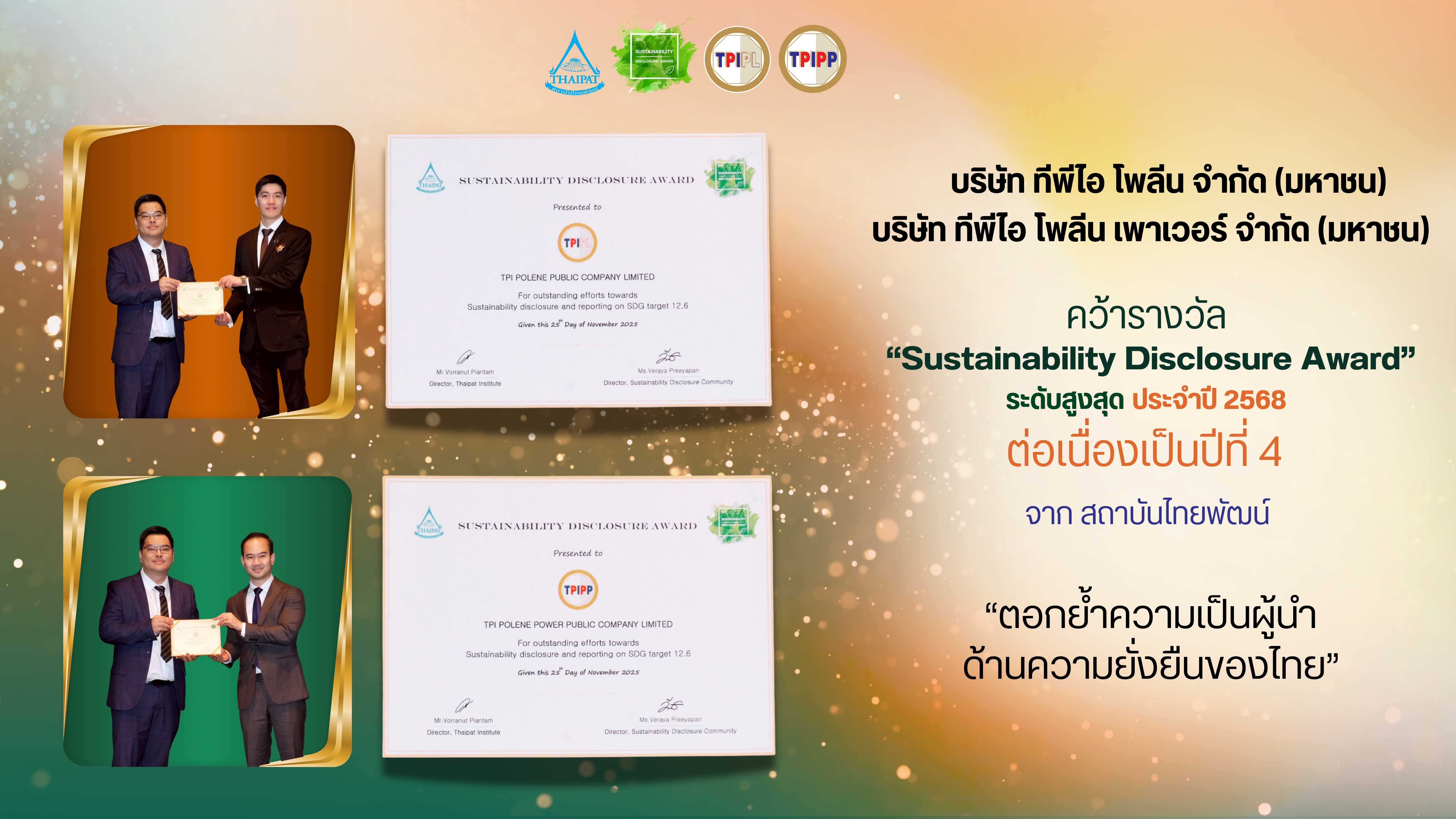 เมื่อวันที่ 25 พฤศจิกายน 2568 บริษัท ทีพีไอ โพลีน จำกัด (มหาชน) และ บริษัท ทีพีไอ โพลีน เพาเวอร์ จำกัด (มหาชน) ได้รับรางวัลการเปิดเผยข้อมูลความยั่งยืน (Sustainability Disclosure Award) ประเภทรางวัลเกียรติคุณ (Honorary Award) ประจำปี 2568 จากสถาบันไทยพัฒน์ ต่อเนื่องเป็นปีที่ 4 ซึ่งเป็นระดับรางวัลสูงสุด สะท้อนถึงมาตรฐานการเปิดเผยข้อมูลด้านความยั่งยืนที่โปร่งใส และครบถ้วนตามหลักสากล